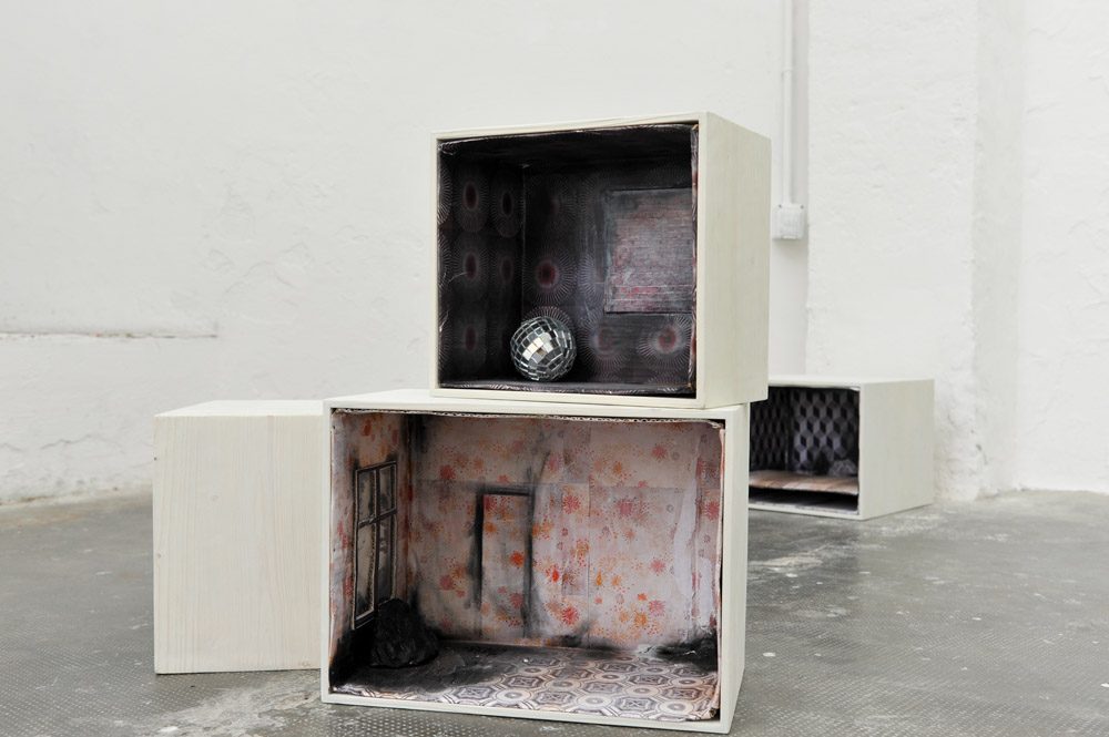 • Scatole che raffigurano stanze quasi vuote. Qualcosa o qualcuno non c’è più, è appena andato via, forse per mettere in evidenza chi sono i veri, invisibili abitanti di queste stanze: un’irradiazione, un indizio, una persistenza. La gracile solennità di queste cripte portatili sembra confidenziale, a portata di chiunque, ma le loro piccole dimensioni risultano inospitali. Allora, chi vive lì dentro? Forse il brivido di un ideale, una potenza, una grave esperienza del mondo.